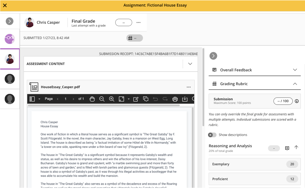 Blackboard Ultra now includes a new Flexible Grading interface to support grading by question, student, or a mix and match approach. Flexible Grading provides a streamlined navigation to help prioritize grading by instructor preference and need.