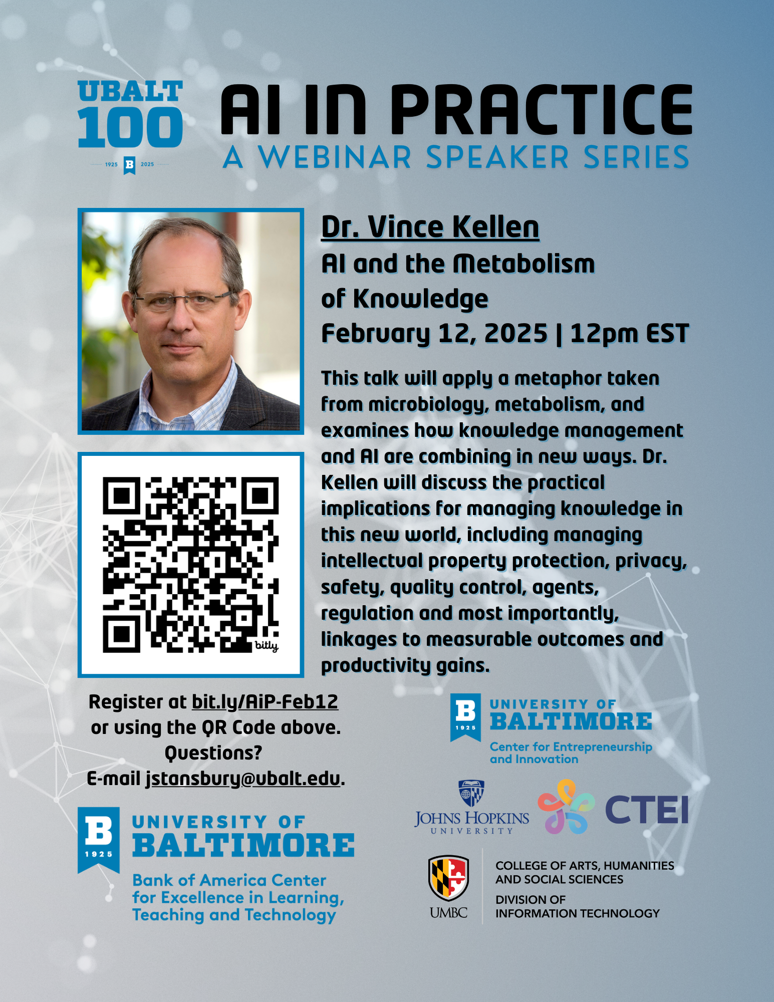 Join UMBC colleagues for a "joint viewing" (and lunch) of this talk that is part of an "AI in Practice" webinar series by the University of Baltimore's Center for Excellence in Learning, Teaching and Technology (CELTT). It is also co-sponsored by Johns Hopkins University and UMBC's College of Arts, Humanities, and Social Sciences (CAHSS) and Division of Information Technology (DoIT).